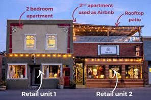 Renovated mixed-use property with two retail units, two upper-level apartments, and a standout 895 sq ft split-level rooftop terrace with established trees, wind protection, and excellent privacy. Retail Unit 1 (approx. 1,000 sq ft) is currently a photographic boutique with original brick, hardwood floors, high ceilings, modern lighting, and updated electrical/plumbing. Retail Unit 2 (approx. 3,800 sq ft) is currently configured as a multi-vendor boutique layout with open floor space, a rear loading dock, a distinctive bank vault, and updated electrical/plumbing (with some original finishes retained). Upstairs, Apartment 1 (Airbnb-designed) is a one-bedroom loft (1,174 sq ft) with large windows and treetop views, two half baths plus a separate shower room, and a modern kitchen with a six-seat diner-style bar. Apartment 2 (owner’s residence) is a two-bedroom plus den (1,132 sq ft) with heated hardwood floors, a monochrome kitchen (induction cooktop, convection oven, integrated dishwasher), and a primary suite featuring double sinks, double showers, bubble-jet tub, and Japanese toilet. Both apartments include built-in planters with live greenery and direct access to the rooftop terrace. The property also offers a poured concrete basement (approx. 2,400 sq ft) with storage, office, and washroom, plus two off-street parking stalls with plug-ins. Renovated in 2015 with renewed HVAC, electrical, and plumbing, including 400 Amp service with distributed sub-panels. Gross income: $90,248. NOI: $66,375.00 (Cap rate 8%).